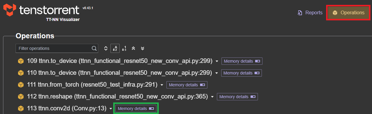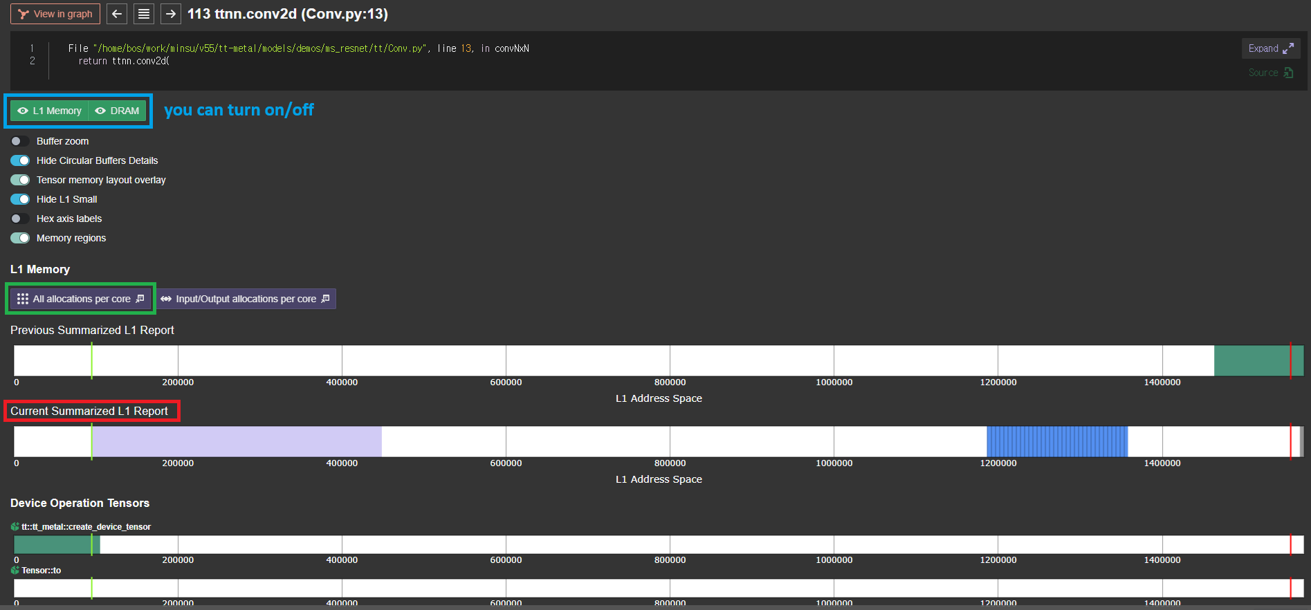 In the menu at the top, you can observe the memory area through [Operations, Tensors, Buffers, Graphs], and you can usually check the L1 area for each operation by pressing [Memory details] after each Op in the [Operations] menu.